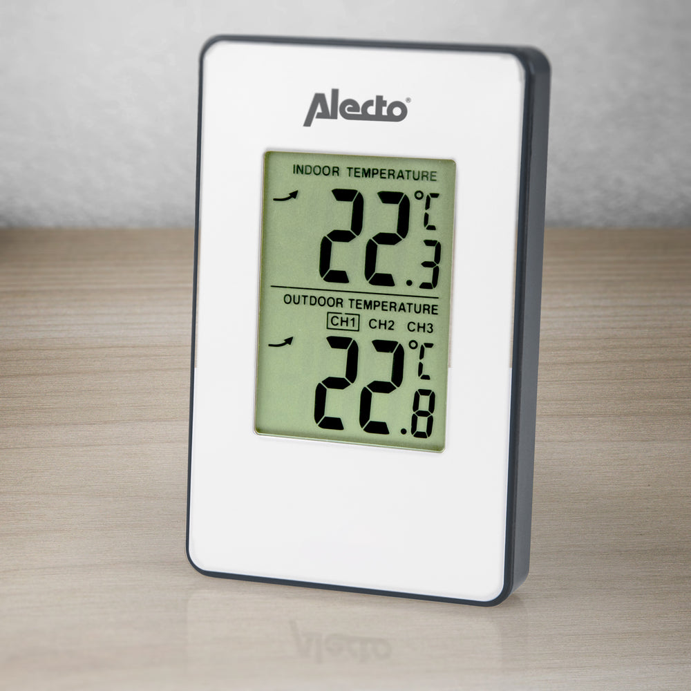 De WS-1050 is een compact basic weerstation van Alecto, dat zowel de temperatuur van binnen als buiten weergeeft. De buitentemperatuur wordt door de WS-1050 gemeten met een draadloze sensor. De draadloze buitenunit werkt op een tweetal AAA-batterijen. Vanaf het moment dat je de buitenunit hebt geïnstalleerd meet deze voortdurend de buitentemperatuur, en stuurt de gegevens naar je weerstation binnen. Op het grote, goed af te lezen display zie je real-time welke temperatuur het buiten is. De WS-1050 onthoudt de laatste minimum- en maximumtemperatuur. Dat is handig: zo lees je in een oogopslag af hoe warm of koud het de afgelopen dag of nacht was.