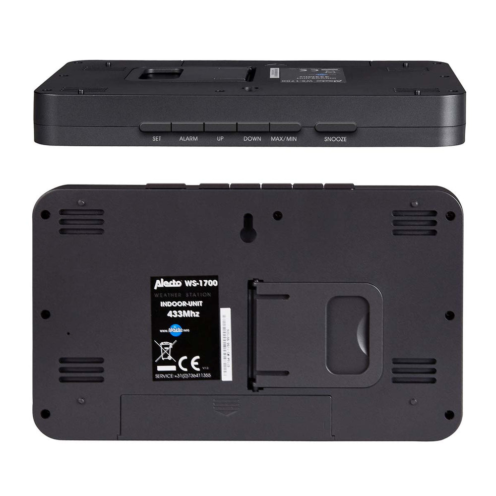 De geanimeerde weersvoorspelling omvat veel informatie. Je krijgt de binnen- en buitentemperatuur en de luchtvochtigheid voor zowel binnen als buiten. Je ziet de laagste en hoogst gemeten temperatuur en luchtvochtigheid van het afgelopen etmaal. Bovendien kun je de maanstand aflezen en gaat er bij een te lage of hoge temperatuur een alarm af. Daarnaast heb je een klok met datum en alarm, een eeuwigdurende kalender en een batterij-bijna-leeg indicatie. Met Alecto kies je voor ee n doordacht en gebruiksvriendelijk product van hoge kwaliteit.