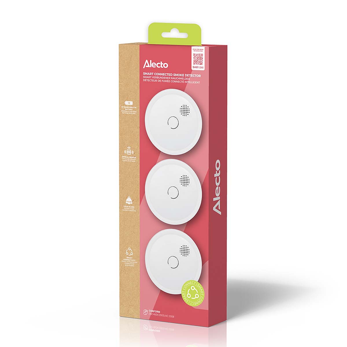 De Alecto SA61 3X is een set met drie rookmelders (typenummer SA61) die draadloos met elkaar gekoppeld kunnen worden. Hierdoor ontstaat extra brandveiligheid. Je omgeving wordt optimaal beveiligd, want als er één melder rook of brand detecteert geven alle gekoppelde rookmelders alarm. Deze draadloze koppelbare rookmelder heeft een batterij én optische sensor die 10 jaar mee gaan. Met de SA61 3X ben je 10 jaar verzekerd van een veilige omgeving. En vanzelfsprekend voldoet deze rookmelder aan de hoogste Europese keuringen en eisen.