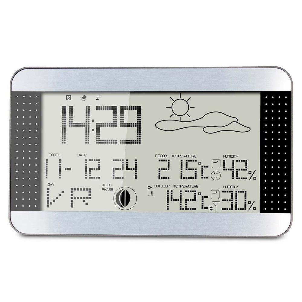 De geanimeerde weersvoorspelling omvat veel informatie. Je krijgt de binnen- en buitentemperatuur en de luchtvochtigheid voor zowel binnen als buiten. Je ziet de laagste en hoogst gemeten temperatuur en luchtvochtigheid van het afgelopen etmaal. Bovendien kun je de maanstand aflezen en gaat er bij een te lage of hoge temperatuur een alarm af. Daarnaast heb je een klok met datum en alarm, een eeuwigdurende kalender en een batterij-bijna-leeg indicatie. Met Alecto kies je voor ee n doordacht en gebruiksvriendelijk product van hoge kwaliteit.
