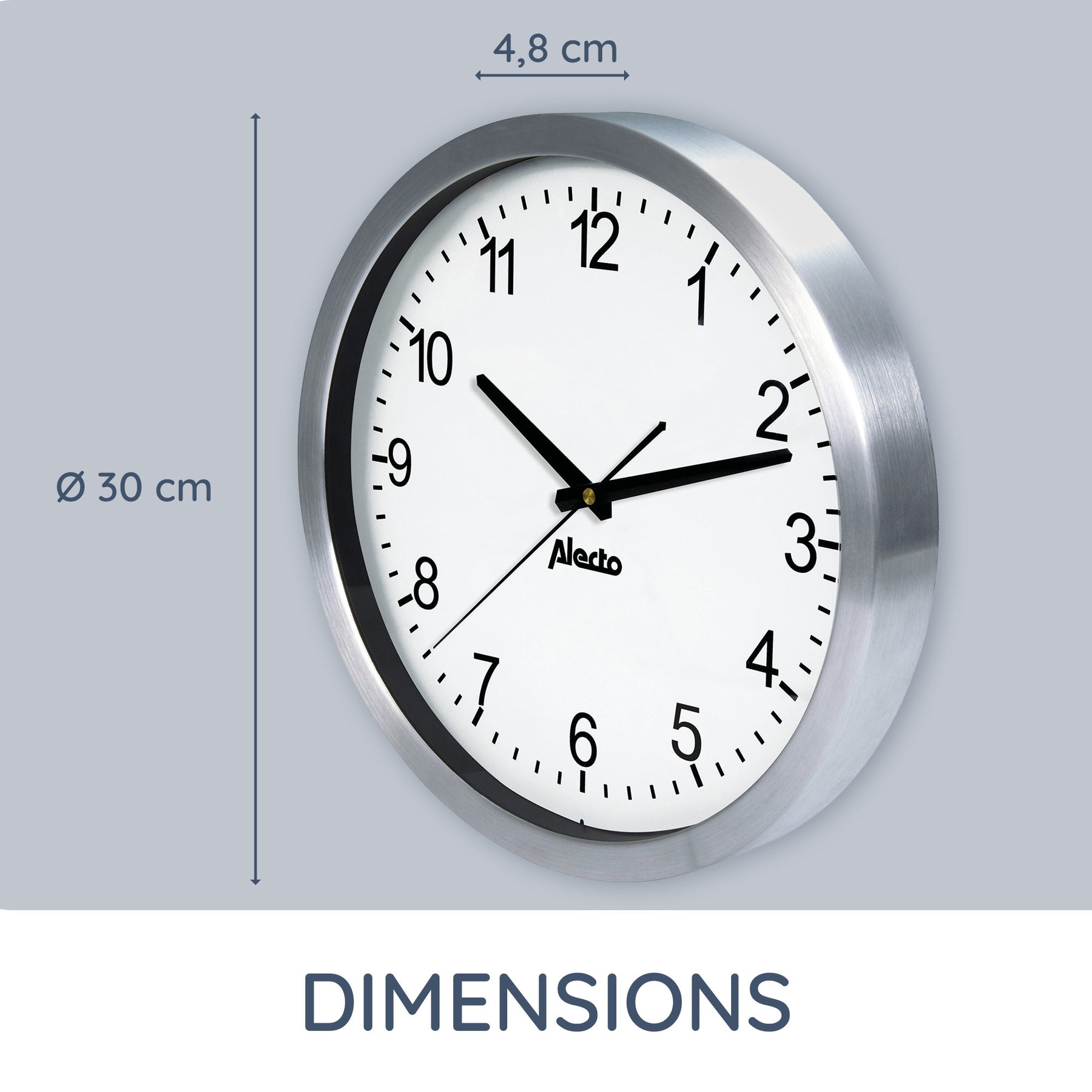 Deze aluminium klok geeft de tijd analoog aan. Met een doorsnede van 30 centimeter kun je de klok in grote ruimten gebruiken; dankzij de extra grote wijzerplaat is de tijd ook van een afstand prima te lezen. En een erg prettige specificatie bij een analoge klok: het uurwerk is stil. Hang je de klok op je werk, dan wordt je dus niet afgeleid door het tikken.