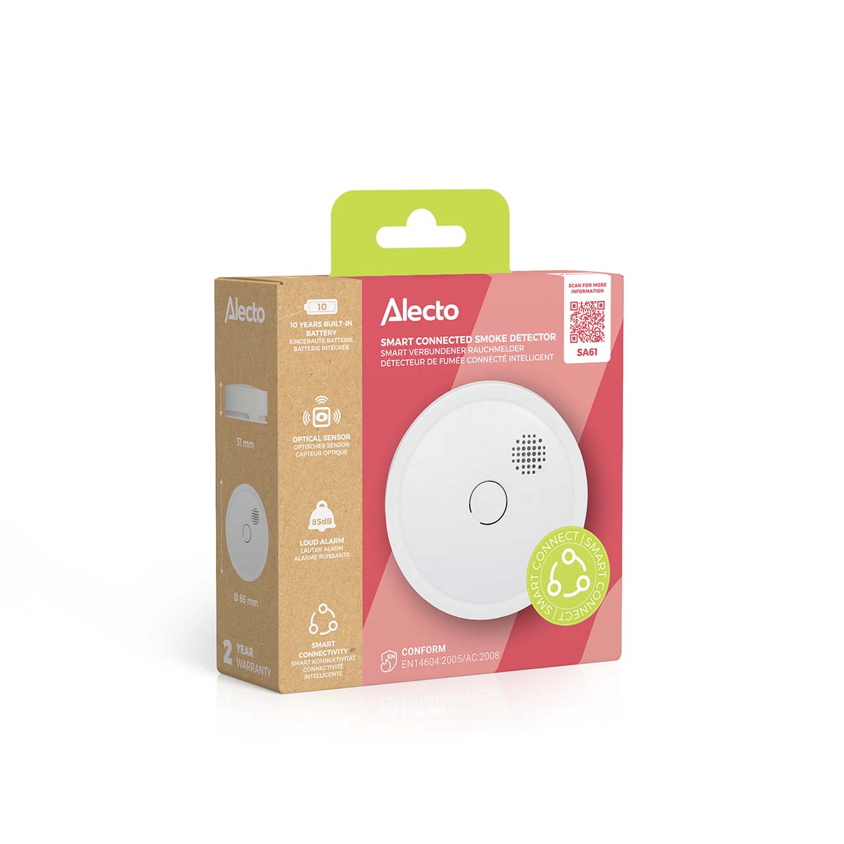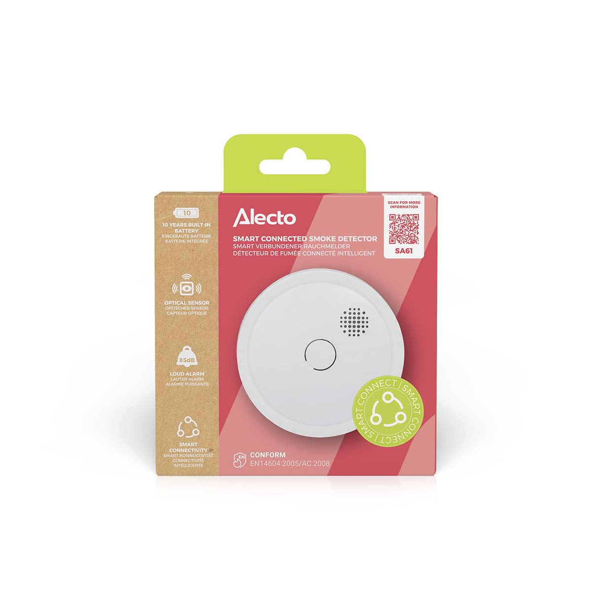 De Alecto SA61 rookmelder is draadloos te koppelen met andere rookmelders waardoor extra brandveiligheid ontstaat. Je omgeving wordt optimaal beveiligd, want als er één melder rook of brand detecteert geven alle gekoppelde rookmelders alarm. Deze draadloze koppelbare rookmelder heeft een batterij én optische sensor die beiden 10 jaar mee gaan. Met de SA61 ben je 10 jaar verzekerd van een veilige omgeving. En vanzelfsprekend voldoet deze rookmelder aan de hoogste Europese keuringen en eisen.