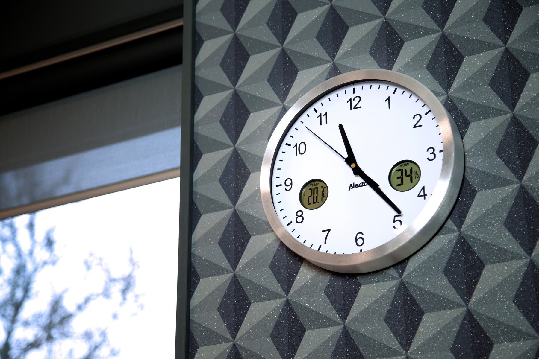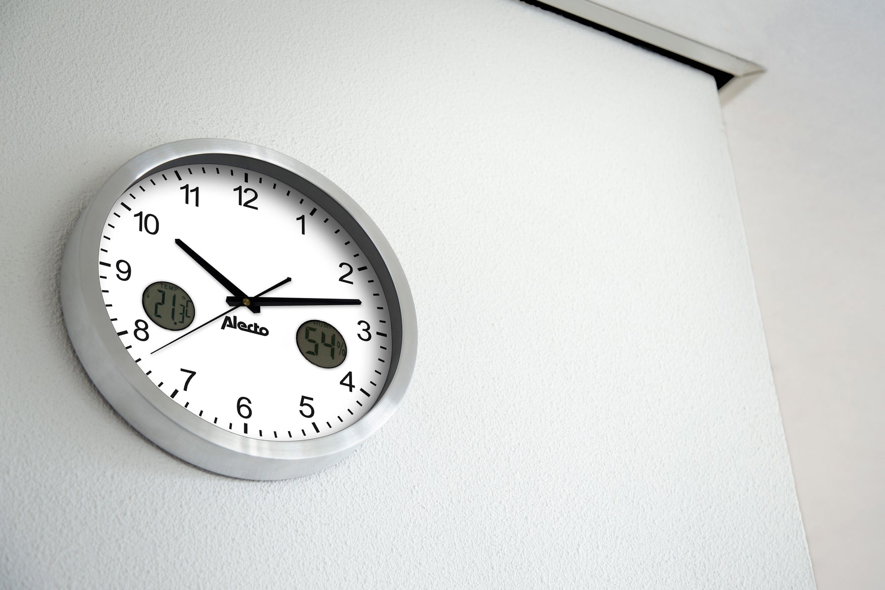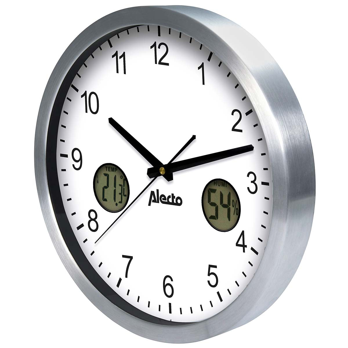 We weten inmiddels allemaal hoe belangrijk een gezond binnenklimaat is voor de mens. In veel kantoortuinen hebben mensen last van de matige luchtkwaliteit, met alle gevolgen voor de gezondheid en productiviteit van dien. Lucht moet bijvoorbeeld genoeg vocht bevatten, zodat je slijmvliezen vochtig blijven. Dat voelt prettig aan voor je mond, ogen en neus, én is een natuurlijke afweer tegen ziektekiemen in de lucht. De hygrometer op deze aluminium klok geeft constant de actuele luchtvochtigheidsgraad aan. Dreigt de lucht droog te worden? Zet dan een bakje water neer, zodat het kan verdampen.