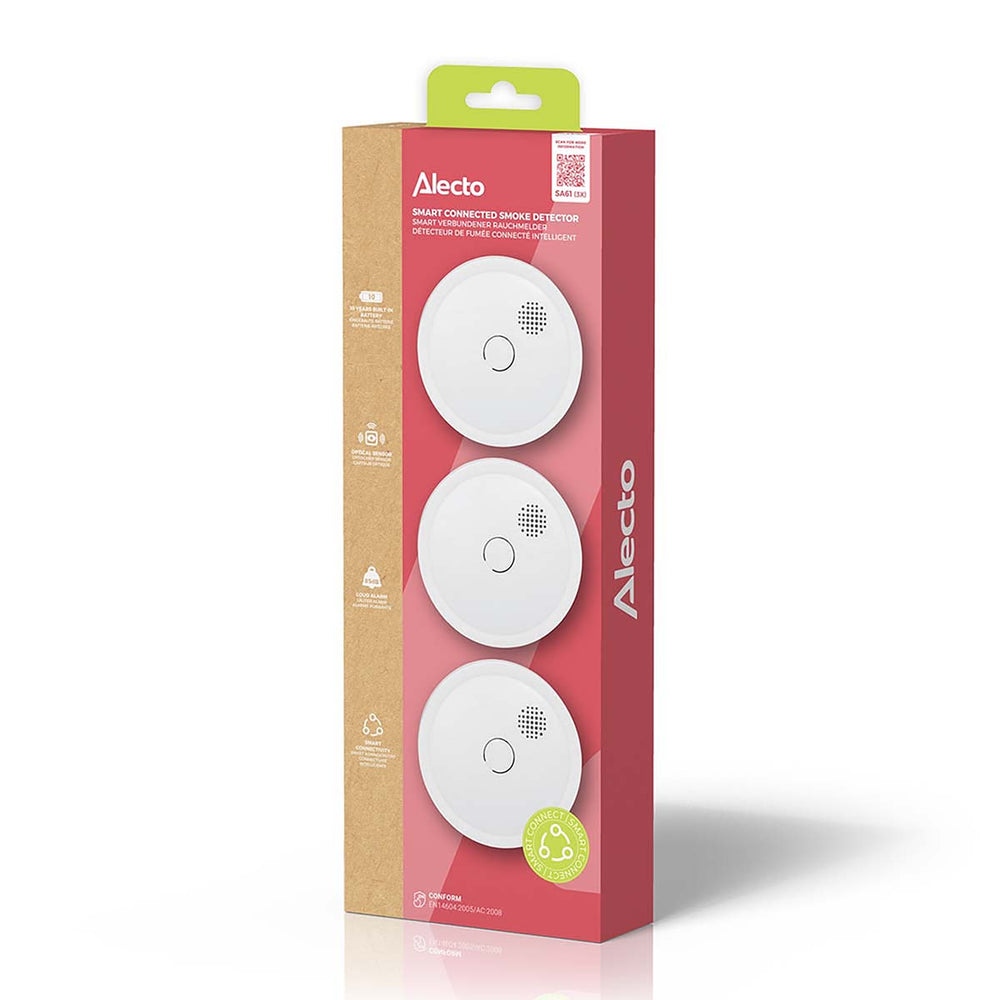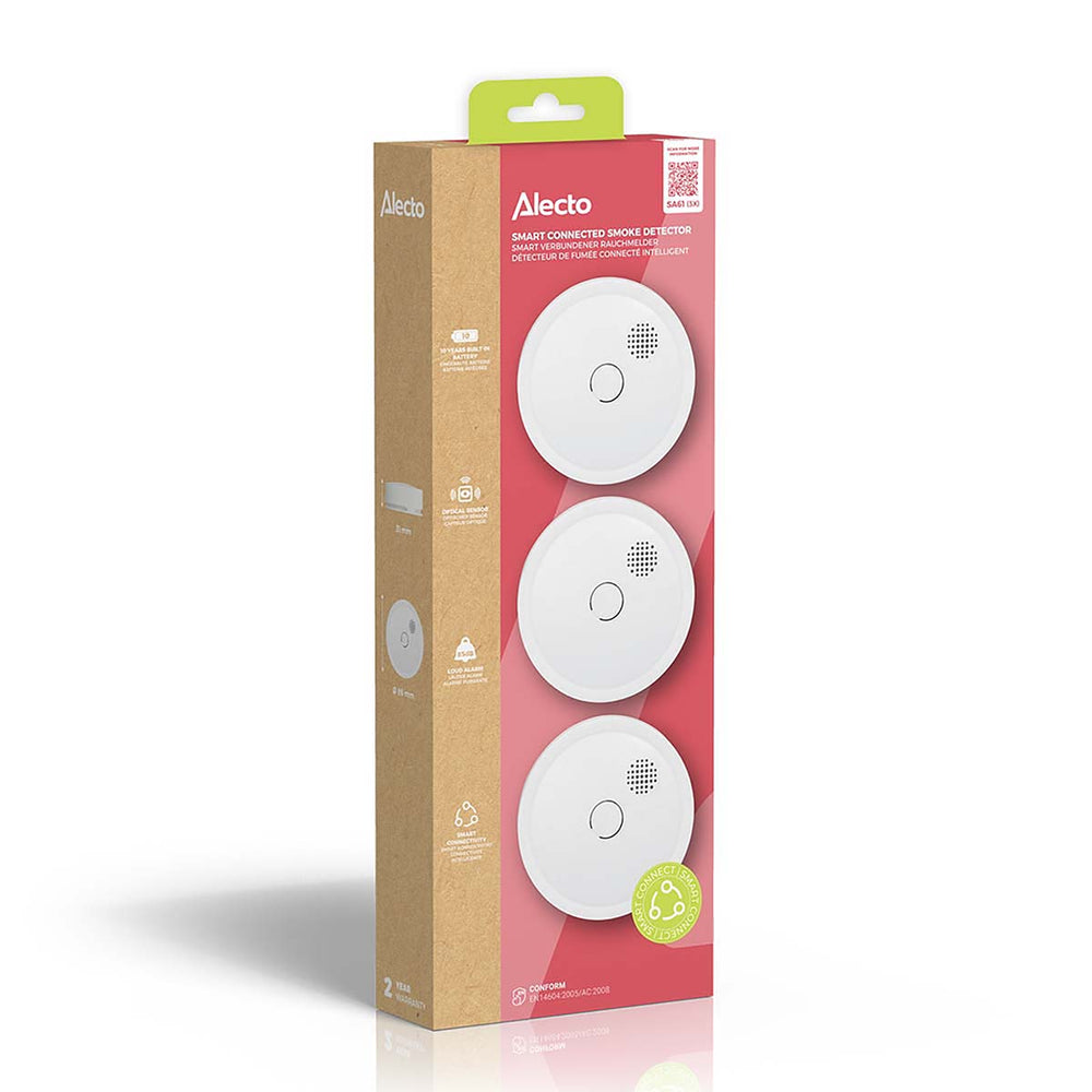 De Alecto SA61 3X is een set met drie rookmelders (typenummer SA61) die draadloos met elkaar gekoppeld kunnen worden. Hierdoor ontstaat extra brandveiligheid. Je omgeving wordt optimaal beveiligd, want als er één melder rook of brand detecteert geven alle gekoppelde rookmelders alarm. Deze draadloze koppelbare rookmelder heeft een batterij én optische sensor die 10 jaar mee gaan. Met de SA61 3X ben je 10 jaar verzekerd van een veilige omgeving. En vanzelfsprekend voldoet deze rookmelder aan de hoogste Europese keuringen en eisen.