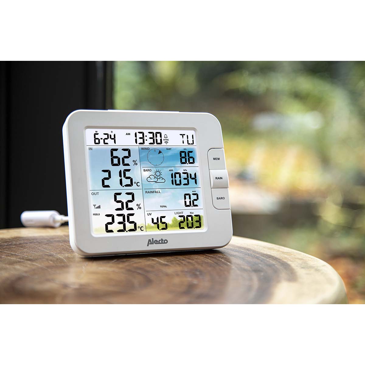 Het grote kleurenscherm heeft ook displayverlichting, ideaal dus voor in het donker. Omdat het display zelf dimmend is, wordt de lichtsterkte van het display automatisch aangepast aan de omgeving. Wanneer de omgeving donker is, dimt het scherm, wanneer het lichter is, licht het scherm meer op. Al deze functionaliteiten maken het weerstation ideaal voor op je nachtkastje, een dressoir of aan de muur.