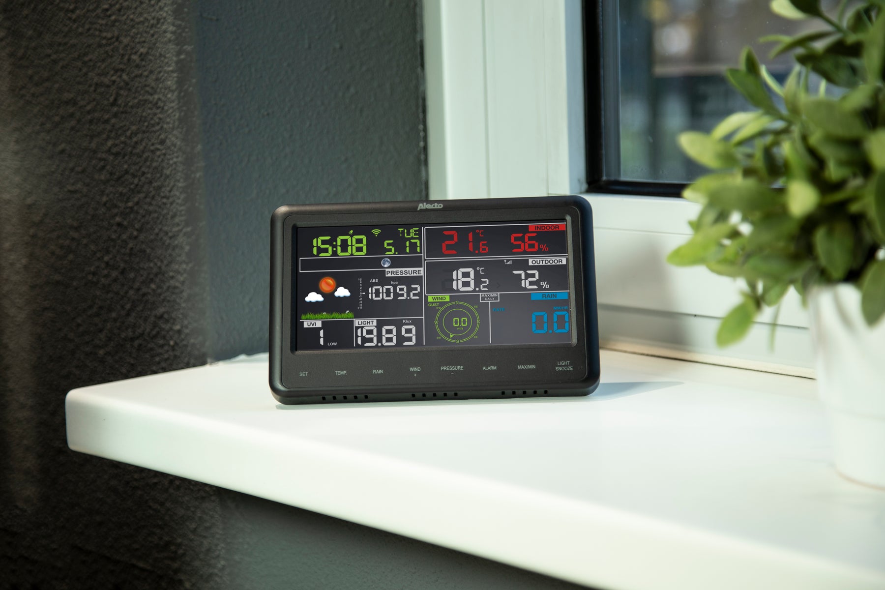 - Sensoren voor: UV en zonnestralen, luchtvochtigheid, windsnelheid en windrichting, luchtdruk, binnen- buiten- en gevoelstemperatuur, neerslag